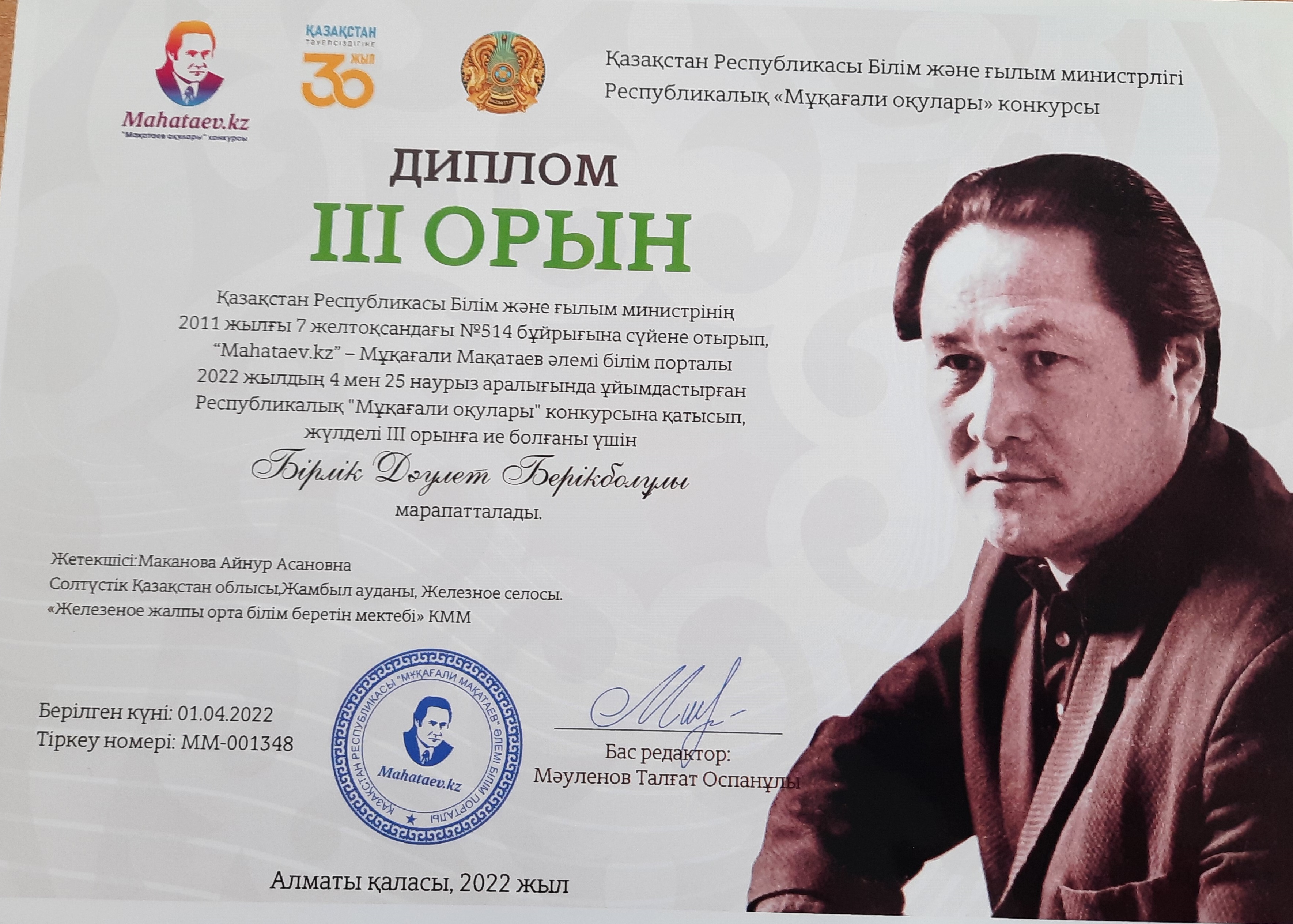В рамках 5-летия программы "Рухани жаңғыру" ученик 3 класса Бірлік Дәулет Берікболұлы принял участие в Республиканском дистанционном конкурсе "Мұқағали оқулары" и занял 3 место.